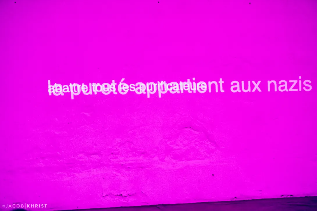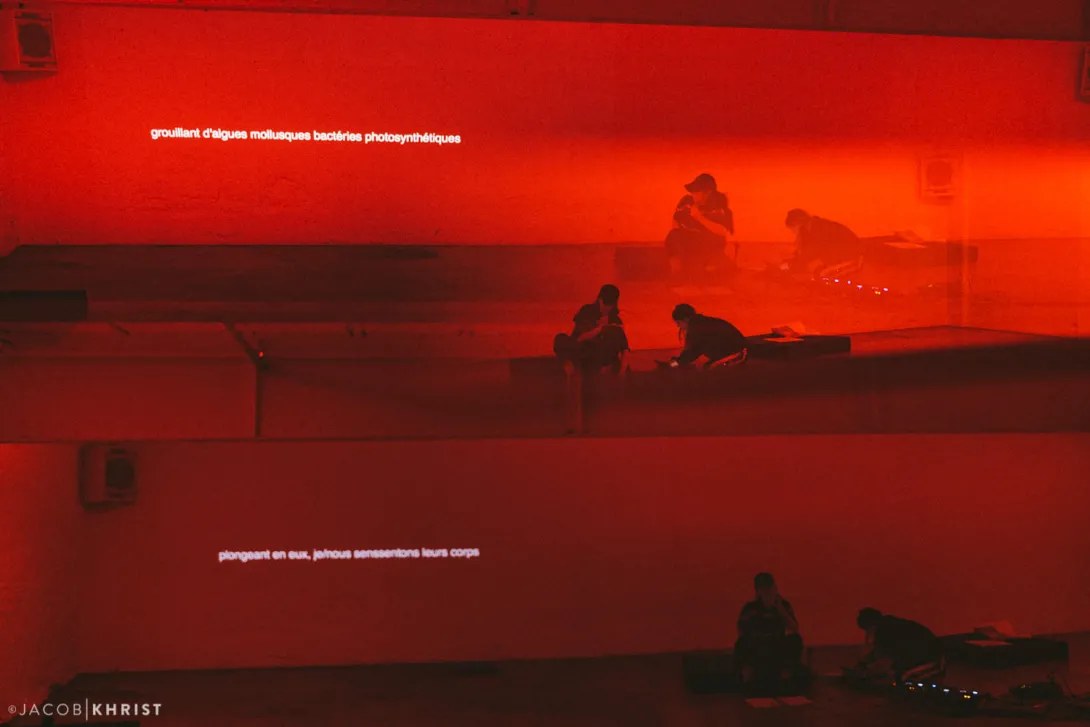 «The Flying Lesbians have returned». A poetic manifesto, the idea of a transcorporeal, tactile, sensitive “I/we”. How to express 'us'? We envision 'us' in a time/space of the future. The water rises, and fragments of archive arrive, diffracted from past trans/feminist manifestos, in waves. The archive is mobile and unstable, haunted by specters, like our memory. The lesbian sewer (SCUM) is our revolutionary infrastructure. The water swarms with toxic substances and vibrant microorganisms. No boundaries between our bodies.